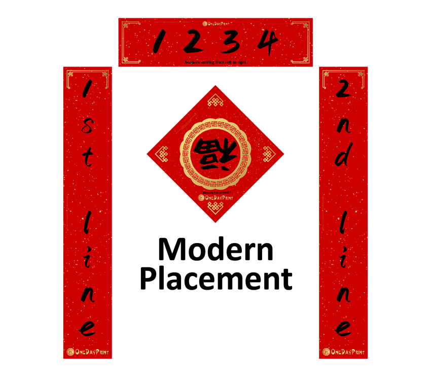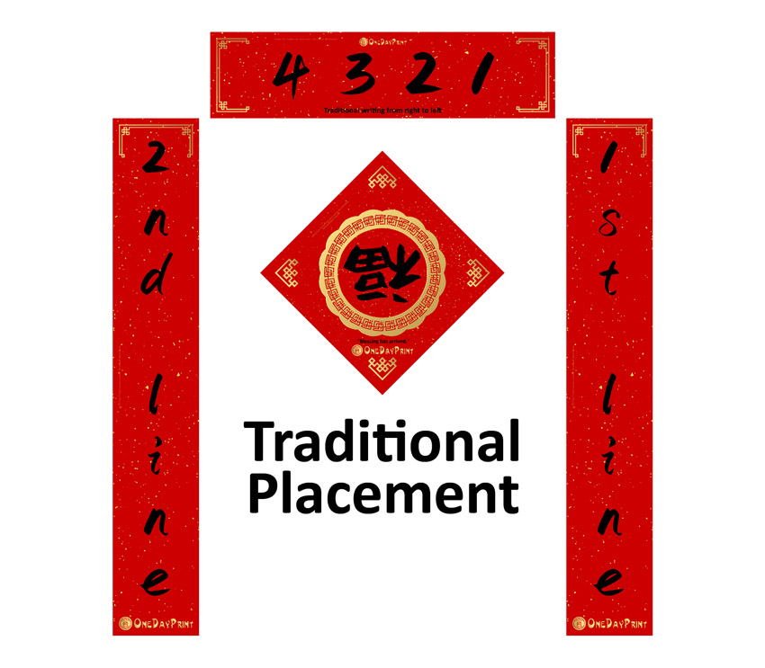Traditionally, the first line is pasted on the right side while the second line is pasted on the left. The horizontal scroll is pasted on top of the door and the Chinese characters are written from right to left.